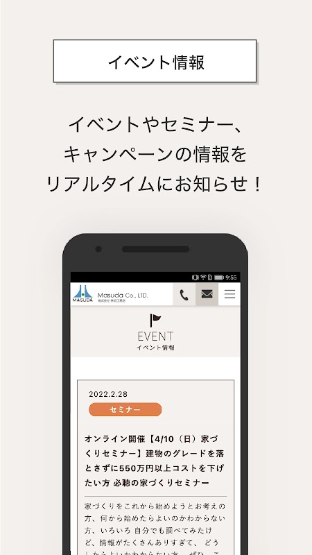 This is the official app of "Masuda Komuten", which proposes materials, construction methods, structures, and designs that best suit the customer's lifestyle in Abeno-ku, Osaka, and provides fun and inspiring home building.