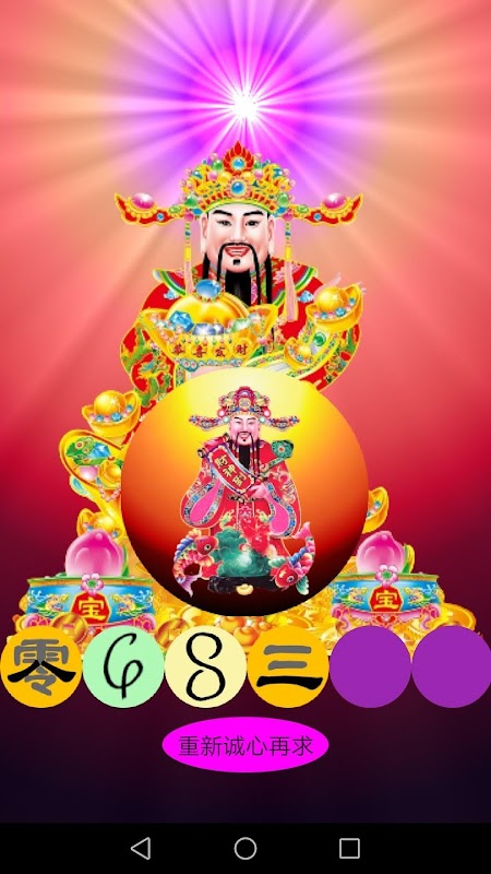 大马财神爷幸运神字,含有多款式幸运号码、图像、音效和显示法,还有中文数字号码显示。只需诚心诚意先掷筊,然后点选想要的号码:1D(单字)、2D(双字)、3D(千字)、4D(万字)、5D(十万字)、6D(百万字),就会显示财神爷幸运号码或神字。