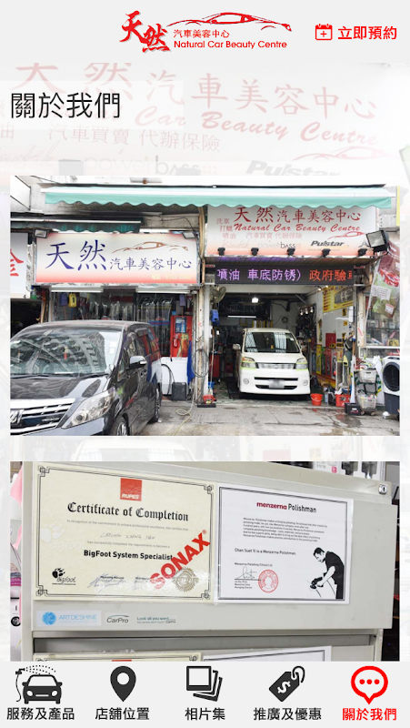 今天的天然汽車美容中心,全然蛻變為一個十人以上的專業美容團隊,誠心誠意為你的汽車提供專業美容服務、維修保養服務、製作車牌、代買保險和驗車等等。專業技術人員都是經過PUPES和MENZERNA頒授專業培訓課程的認證資格,發揮所學之化工及企業管理專才的技能,以提供最專業的美容技術和免費諮詢,使用業界最好的汽車美容蠟品、清潔及保養化學品等等,讓您感受最貼心和最放心的服務品質,絕對有信心保證。