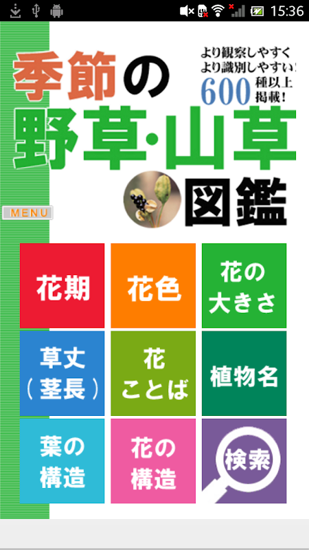 色・大きさ・開花順や、撮った写真から引ける季節の野草・山草図鑑。より観察しやすくより識別しやすい! 600種以上掲載!