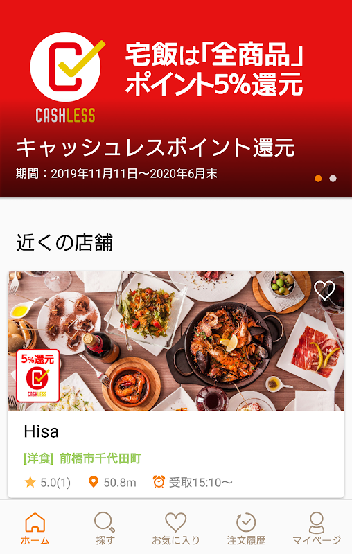 宅飯では、2019年11月11日~2020年6月末の期間中、全店舗・全商品が5%還元対象になります。