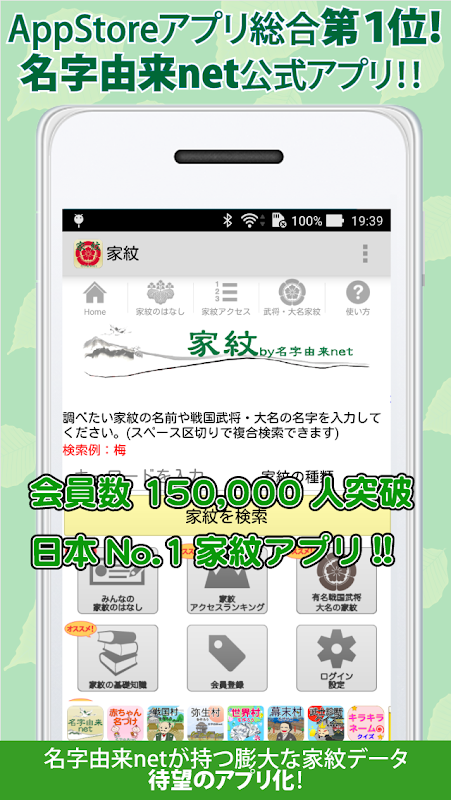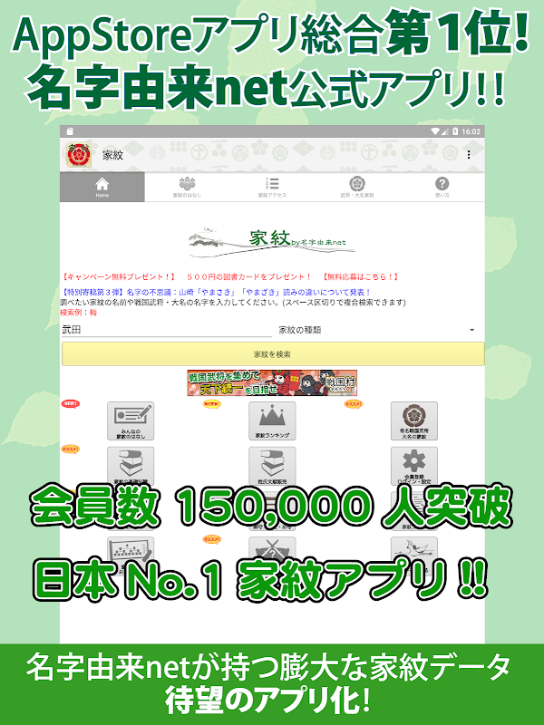 Covers over 8000 types of family crests up to 8000 in Japan !! Family crest No.1 app Simply enter the name of the family crest you want to look up or the surname of a famous military commander and press the search button to display the information of the family crest you want to know in one shot!