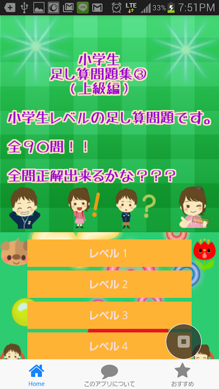 小学生レベルの足し算問題が沢山出てきます、レベル1~レベル9まで全90問の足し算問題が出題されますお子様の足し算の勉強や、予習・復習などにピッタリの内容になっていますので、いちどお試し下さい。