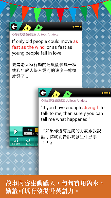 3.外籍老師專業朗讀:勤聽故事,除可大幅增進聽力外,藉由跟讀也能提升口說能力;並佐以音效,讓學習者有如身臨其境之感,浸淫在故事中的有趣情節中,讓心靈徹底接受知識的洗滌,擴增個人的視野及氣質。
