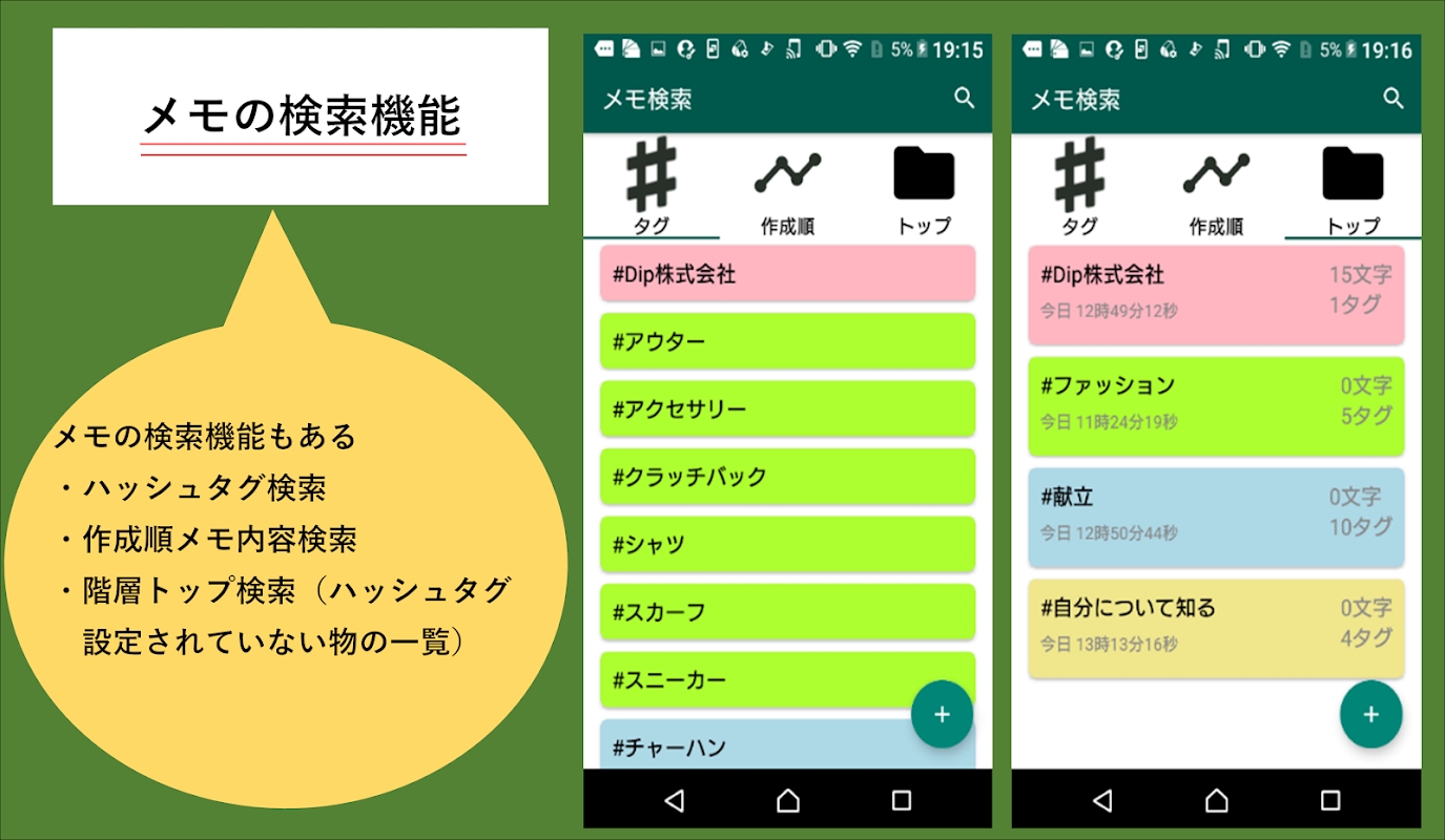 This app is an app that allows you to record (remember) and manage hashtags so that you do not forget the memos you entered. (Synapse map)