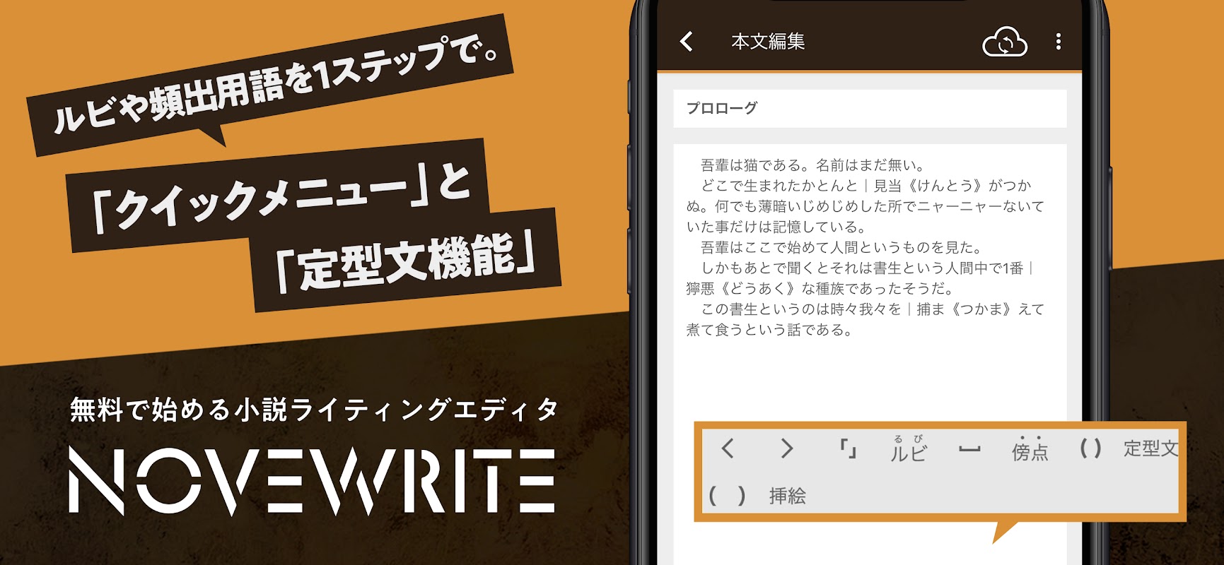 It is a novel editor that allows you to write crisply with quick menus such as ruby, illustrations, parentheses and emphasis marks.