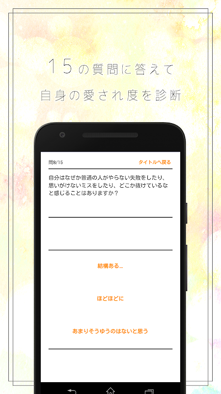 In this app, whether he is loved by everyone how much, you can be diagnosed by questions and psychological tests of 15 that will appear on the exam at random.