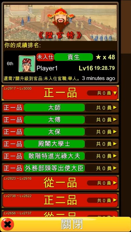 In the game, the official posts of the Qing system are cited, starting from Bai Ding, entering the scientific examination to the number one, and then entering the government system, never entering the ranks, not entering the official rank, and rising up to the first rank official position, going through a total of 290 stages.