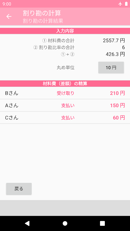 When you select the dish you entered in the app and give a calculation instruction to the app, the settlement amount of each participant will be displayed.