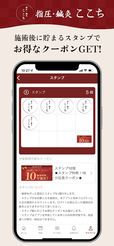 You can receive the latest information and deals of shiatsu acupuncture and moxibustion Kokochi through the app. In addition, you can check the menu and desired time slot and make reservations from your smartphone at any time. By installing the app, you can use shiatsu, acupuncture and moxibustion Kokochi more conveniently.