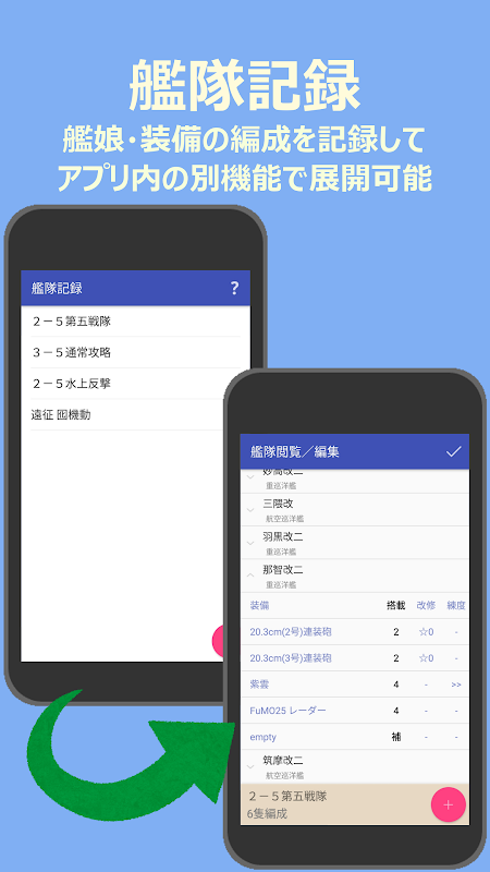 艦これ用支援ツールです。艦娘・装備図鑑、改修予定表、与ダメ計算、制空値計算、索敵計算、資源のグラフ管理、開発・建造レシピメモ、経験値計算、艦隊記録