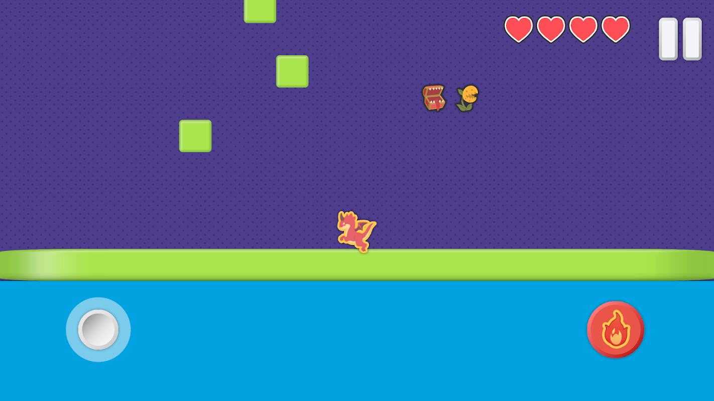 The flow of the game is that the player decides the direction using the ``direction button'' at the bottom left of the screen, and can fire bullets using the ``fire button'' at the bottom right.