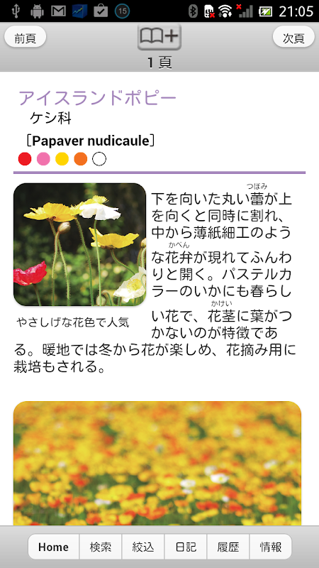 庭や道端などで撮った花の画像を認識させることで画像の花色に近い花を検索できます。