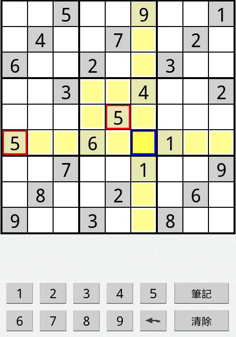 數獨的玩法是以數字填上數獨裡的每一格,使得數獨裡的每一行、每一列和每一個 3x3 的大格,都包括了 1 至 9 裡的每一個數字。