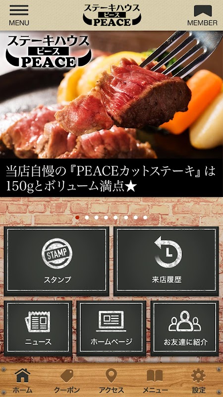 このアプリでは、ステーキハウス「PEACE」の色々な情報やアプリユーザー限定のお得なサービスが手に入ります!