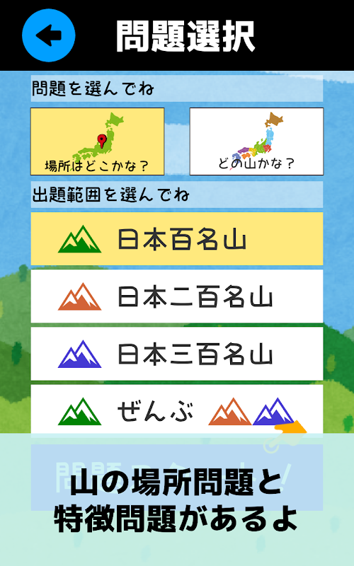 日本百名山、二百名山、三百名山それぞれで100問出題されるよ。