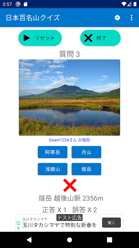 A quiz to guess the mountain name with 4 choices from the pictures of 100 famous mountains in Japan