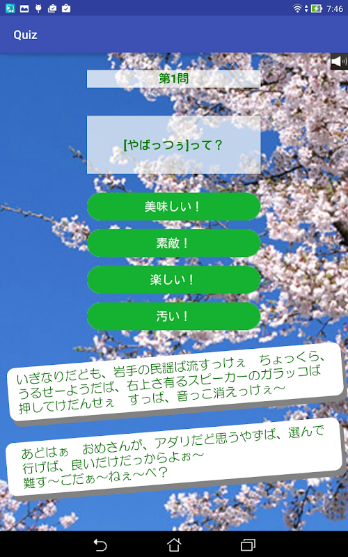 暇つぶしにぴったりな四択岩手弁クイズ!岩手人でも、意外と知らない岩手弁。操作も簡単なので気軽に遊んでみてネッ!(無料)