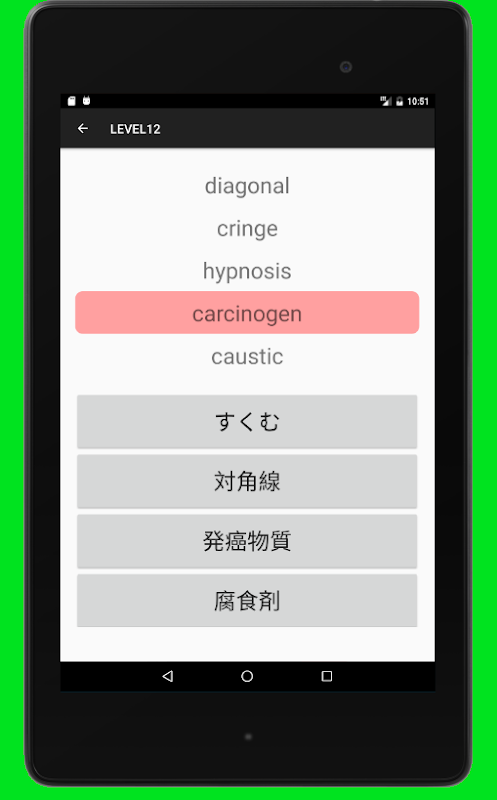 間違った英単語を選ぶとその意味が正解となる英単語が青色で示されます