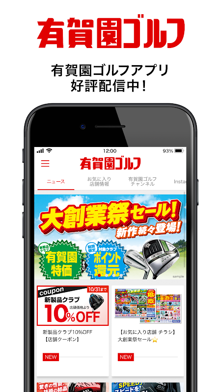 We deliver a wealth of content such as point cards and coupons that can be used at Arigaen Golf, introduction of new golf items, campaigns, viewing of leaflets, video distribution, SNS, and store information.