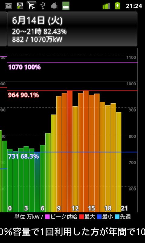画面最上部は、最新の電力情報と気象庁提供の気象情報が表示され、下部は電力情報のレインボーグラフ表示(過去にさかのぼった電力の履歴)です。横画面では一週間分まとめて表示されます。