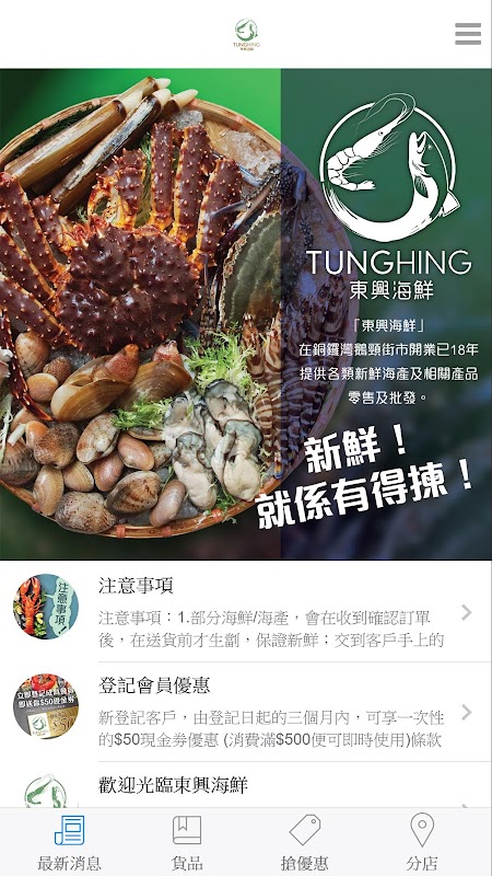「東興海鮮」在灣仔鵝頸街市開業18年。為著大家緊貼我們資訊及快捷訂購,推出此APP。提供時令新鮮海產、不定時優惠、新貨提示、會員、儲積分、換領禮券及折扣優惠等。