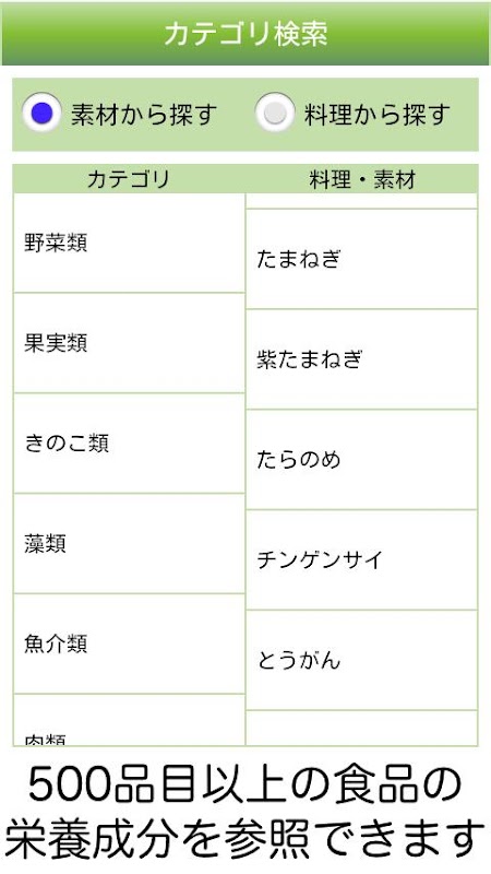・500種以上の食材の栄養素データが閲覧できます。また、データにない食材データを新たに追加することも出来ます。