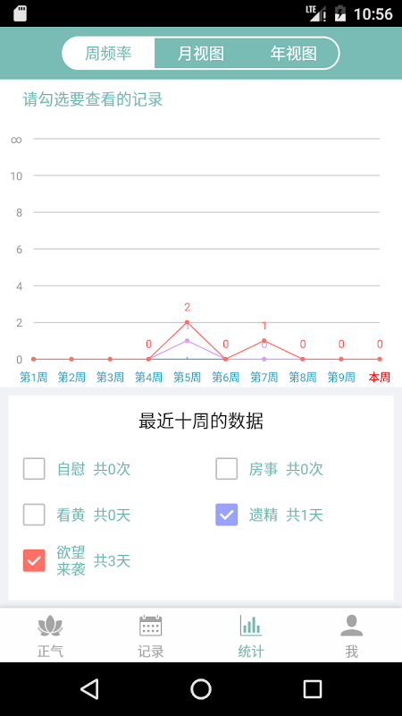 【统计图表】提供周频率,月视图,年视图三种模式的图表,展示每项记录的持戒历程和趋势