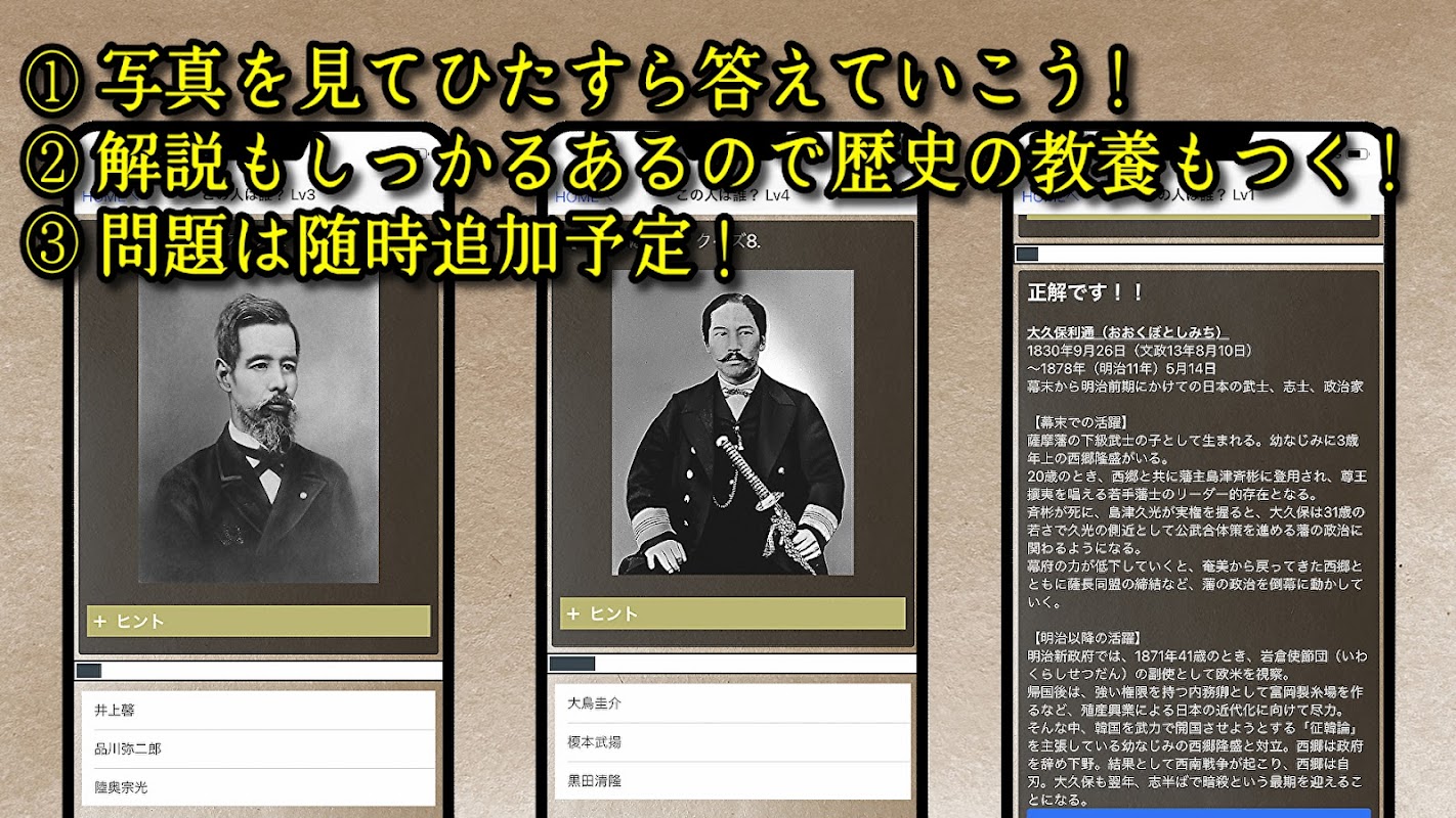 It is a history quiz app that looks at pictures of famous people from the end of the Edo period and the Meiji Restoration and guesses their names.