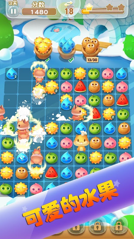 玩法:單機,無需聯網,有三消,四消,五消,T型消除,生產可愛的貓,狗,鼠和大水果,玩法新穎,特效絢麗。