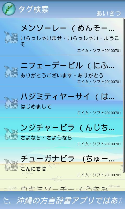 沖縄の方言を調べるアプリです。沖縄が好きなあなた、是非一度試してください。方言をカテゴリ別に調べられるようになっており、単語の解説には使う場面、ニュアンスを記載しています。