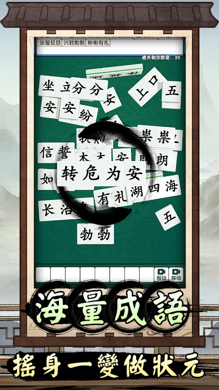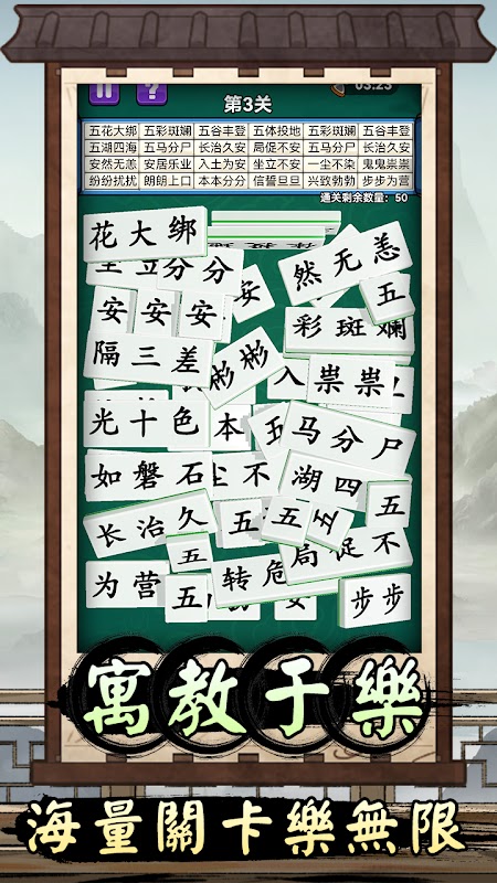 Welcome to "Eliminate Idioms", a puzzle game that combines traditional culture and modern entertainment. Here you will challenge yourself to piece together a complete idiom by selecting word blocks. Each level is carefully designed to test your idiom reserve and exercise your quick thinking. Within ten steps, can you discern the opportunity and spell out the correct idiom? Come join us and start a journey of idioms full of wisdom and fun!