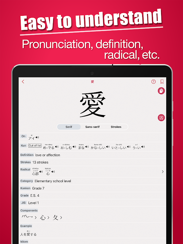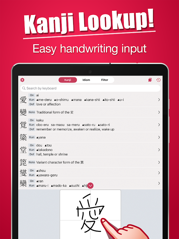 Handwritten Kanji search - Let's study kanji idioms, example and pronunciation!