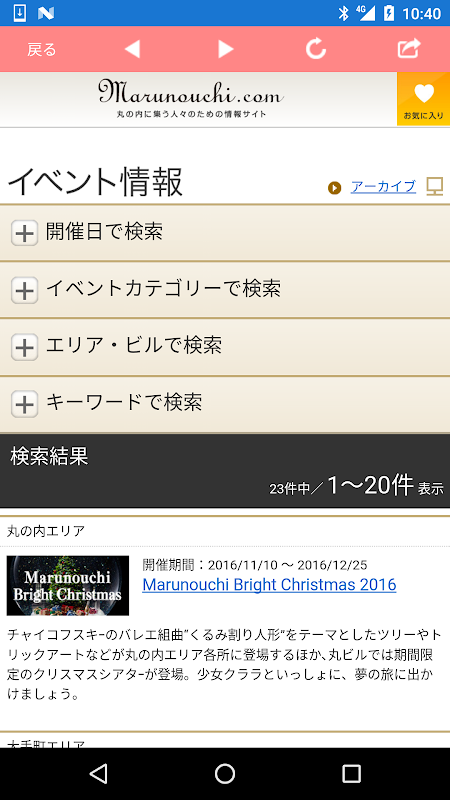 The free tour bus app is an application that allows you to check information on the three bus routes operated by Hinomaru Jidosha Kogyo: "Marunouchi Shuttle Bus," "Metrolink Nihonbashi," and "Metrolink Nihonbashi E Line."