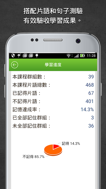 * 使用者可自建片語,並且作記憶和測驗練習。