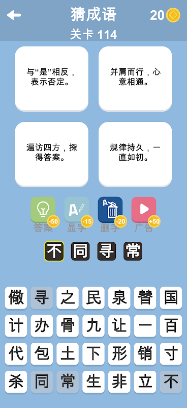 - **Massive idioms, broad and profound:** The game contains more than 7,000 classic idioms, covering the rich heritage of Chinese culture. There are both familiar and common idioms, as well as challenging and uncommon idioms, providing entertainment and learning.