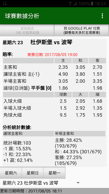 This program analyzes the data of the football league, and uses the percentage results calculated from the previous odds records as a reference. The free version provides both the main and the target players, the goal size and the goal single and double. The paid version is Watch more analysis and odds changes, and see odds results for the past 180 days.