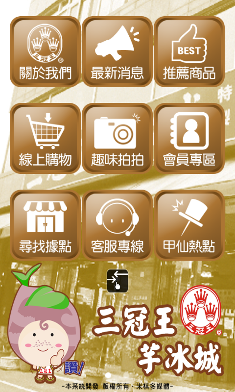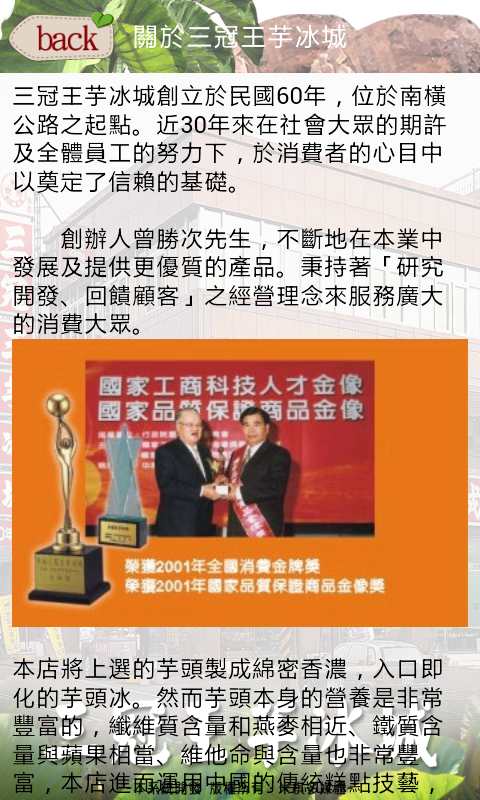 三冠王芋冰城創立於民國60年,位於南橫公路之起點。近30年來在社會大眾的期許及全體員工的努力下,於消費者的心目中以奠定了信賴的基礎。