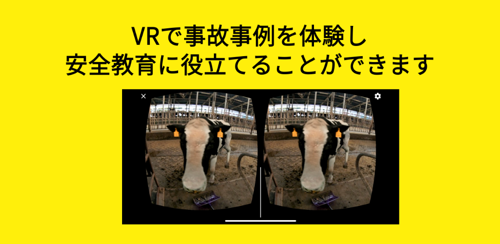 畜産業VR作業事故体験アプリは、作業中の事故を実写VR映像で体感することができる、畜産業に携わる方向けのアプリです。現場での安全意識の向上を目的とし、事故防止に役立つ情報も併せてご提供しています。