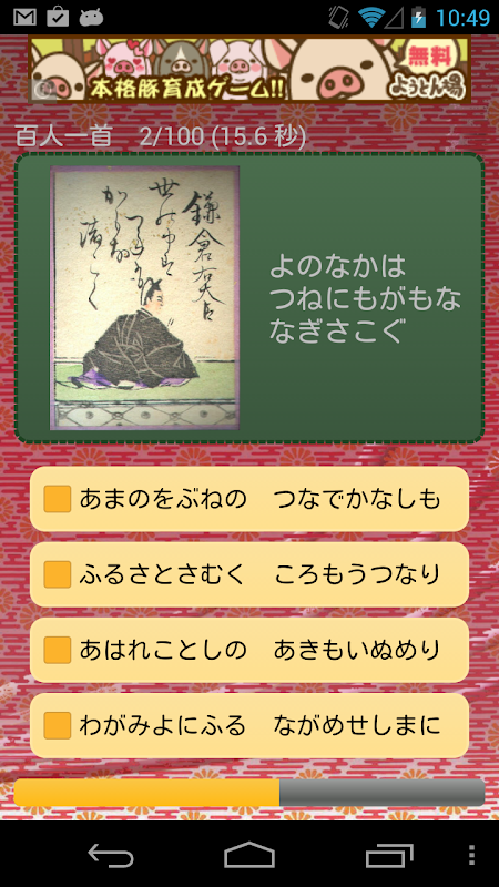 Read Kaminoku of Hyakunin that will appear on the exam, and then select the fit Shimonoku from 4 択.