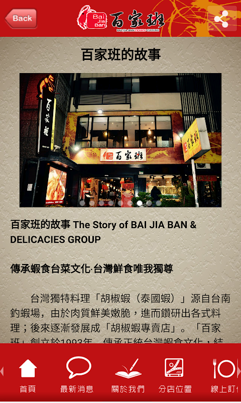 台灣獨特料理「胡椒蝦(泰國蝦)」源自台南釣蝦場,由於肉質鮮美嫩脆,進而鑽研出各式料理;後來逐漸發展成「胡椒蝦專賣店」。「百家班」創立於1993年,傳承正統台灣蝦食文化,結合精典台菜,以成就「台灣鮮食第一品牌」作為集團使命!
