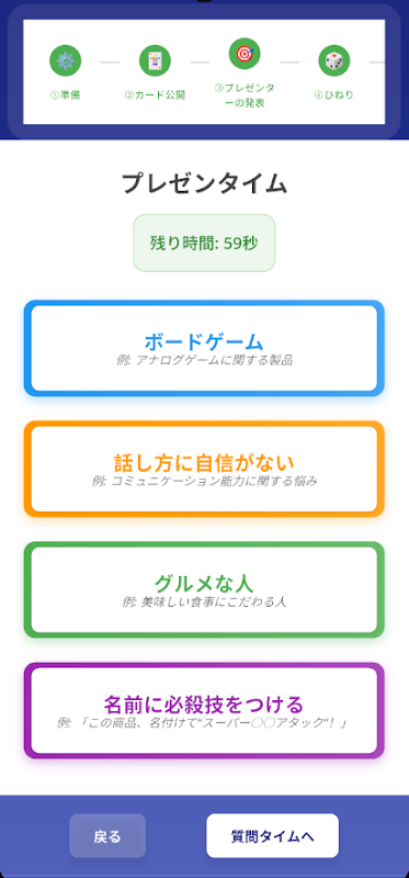 With 15 seconds to prepare, you combine four cards to create a product idea.