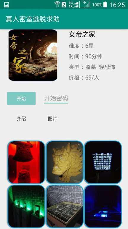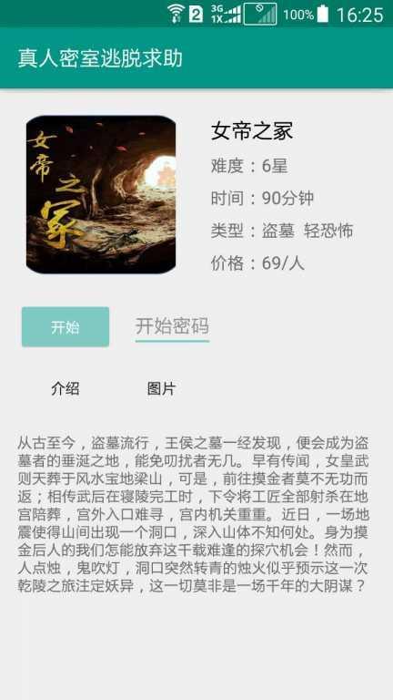 1、主界面提供密室主题内容、图文介绍,员工输入开始码后交给玩家;
