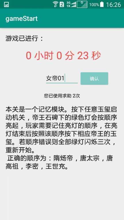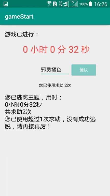 功能界面在游戏开始后计时,玩家可以通过输入求助码自助求助密室中的谜题;应用会2、统计玩家的求助次数;密室结束后玩家输入结束码,计时停止,应用反馈玩家用时和求助次数,并判断是否成功逃脱;