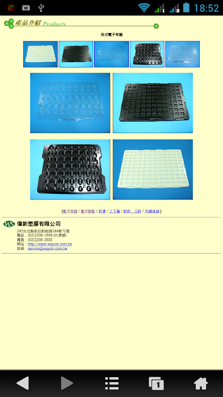 介紹種類適用於電子,五金,機械,文具,醫療,化妝品,花卉,金飾珠寶,玩具,日用品,餐飲,麵包食品,蔬果行業包裝所需塑膠真空成型製品.及客制訂做服務的APP程式!