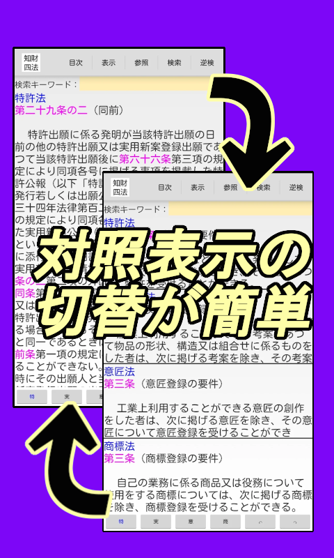 It is an offline application that displays four intellectual property laws (patent law, utility model law, design law, trademark law) in a contrasting format. Please use it for the Intellectual Property Management Skills Test and the qualification of a patent attorney!