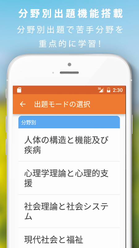 Memorized card for social worker exam + commentary on past questions. Thorough measures with memorized cards and past questions. You can create your own set of questions from each event, field, and questions you are not good at, and you can thoroughly study important items. You can use color sticky notes for review and solve only problems with many mistakes, so you can study efficiently anytime, anywhere during the gap time. The grade function is also substantial, and the answer rate, correct answer rate, and field-specific analysis are performed. Reiwa 2nd year (33rd), Reiwa 1st year (32nd), 2018 (31st), 2017 (30th), 2016 (29th), 2015 (21st) 28 times), 2014 (27th), 2013 (26th), 2012 (25th) recorded
