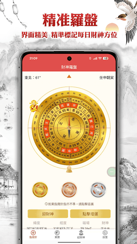 Fortune Compass is a wealth-luck app built on traditional Chinese geomancy (堪舆学), integrating modern technology with age-old wisdom for practical, everyday use. It provides professional feng shui directional guidance, making it an indispensable tool for travel, card or mahjong games, business ventures, feng shui consultations, and similar activities.Fortune Compass offers practical features such as a compass and “Welcoming the God of Wealth” rituals.