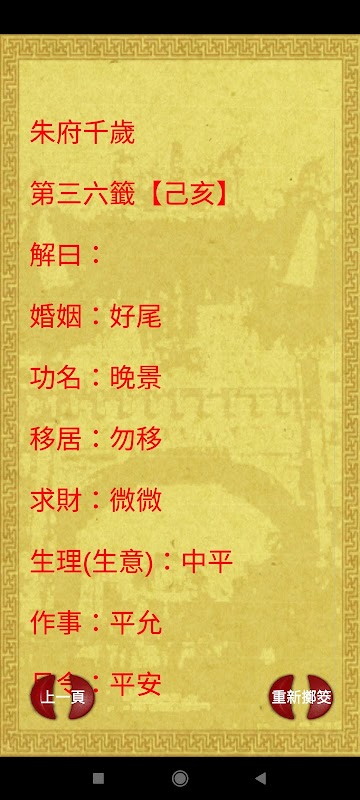 This APP currently worships nine deities (Qiansui Zhufu, Our Lady of Heaven, Emperor Wenchang, Saint King Kai Zhang, God of Wealth, Emperor Guan Sheng, Fude Zhengshen, Guanyin Bodhisattva, and City God). The gods will also be used when asking for fortunes. There are different commonly used fortune-telling poems and references for fortune-telling (Sixty Years fortune, Thunder Rain Master 100 fortune, Guanyin 100 fortune).