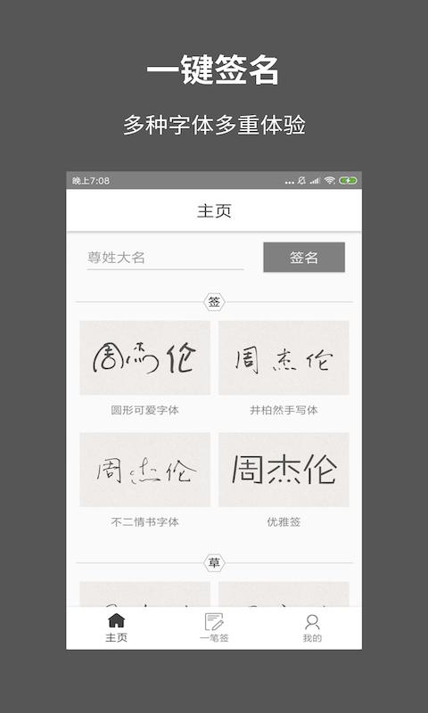 基于多种签名字体的艺术书写形式,提供丰富的签名设计,让你轻松拥有自己的艺术签名。一笔签名、卡通签名、潇洒签名、自豪签名、公文签名、书法签名···无个性,不签名!